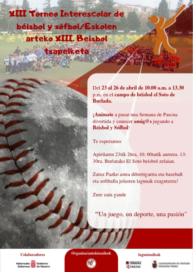 El ya clásico Torneo Interescolar de béisbol llegó a su XIIIª edición la pasada Semana Santa. Un año más , cerca de 240 chicos y chicas de 14 colegios de Navarra se dieron cita en el campo de béisbol de Burlada en 4 jornadas (23 al 26 de abril) para participar en este torneo lúdico y de promoción de nuestros deportes.